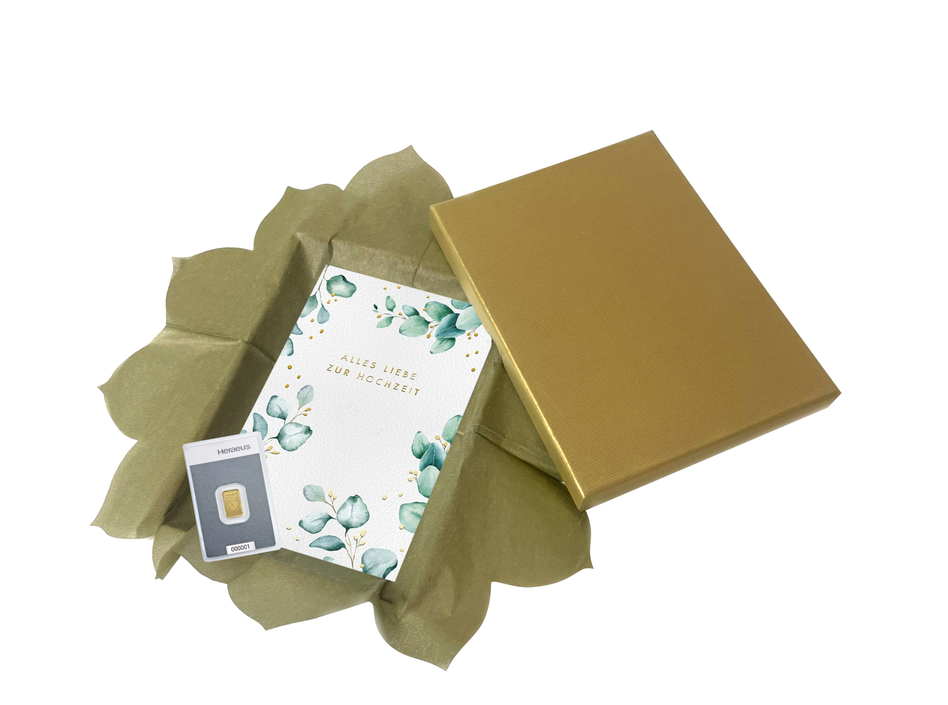 Unser Goldbarrenset mit echtem Gold, ist die perfekte Wahl für Paare, die demnächst heiraten. Um einen bleibenden Eindruck zu hinterlassen, sind das Gold und die Grußkarte in einer hochwertigen Schachtel verpackt.